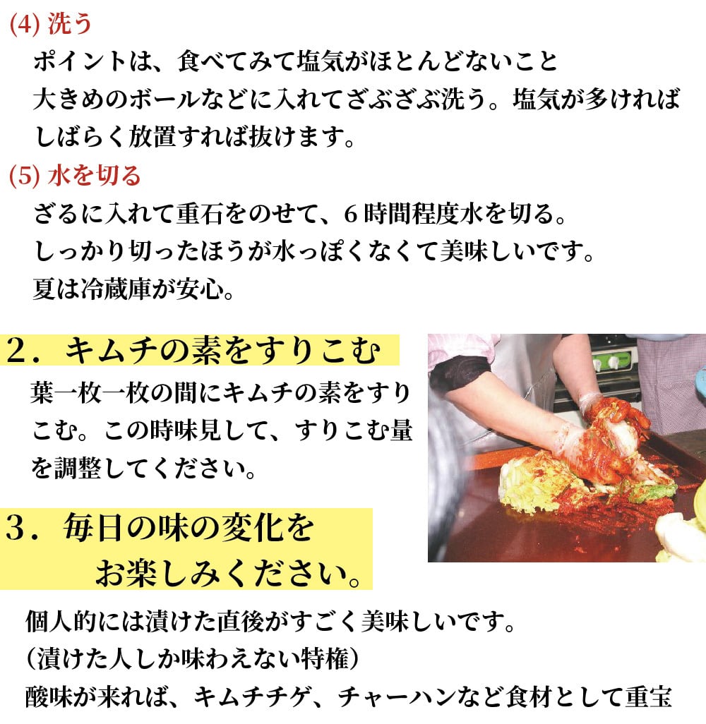 キムチの素1kgで白菜2玉弱漬けられます、白菜キムチ3kg位です。