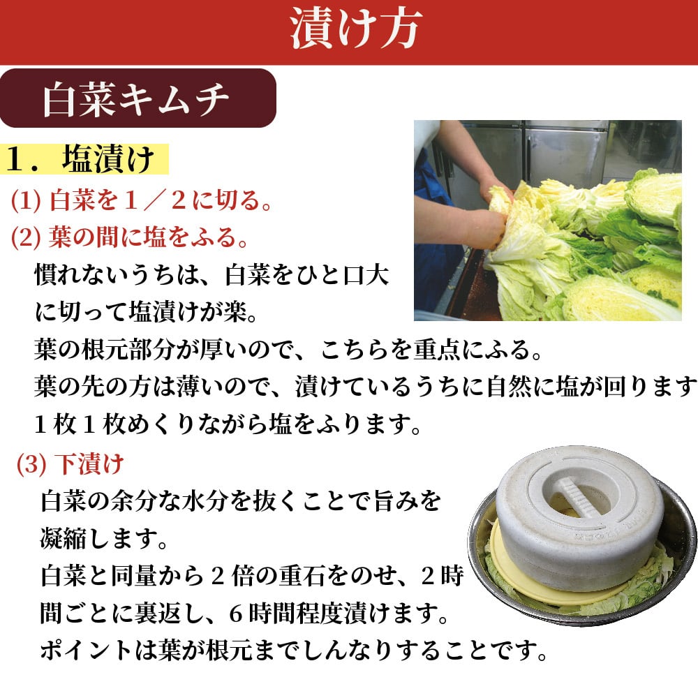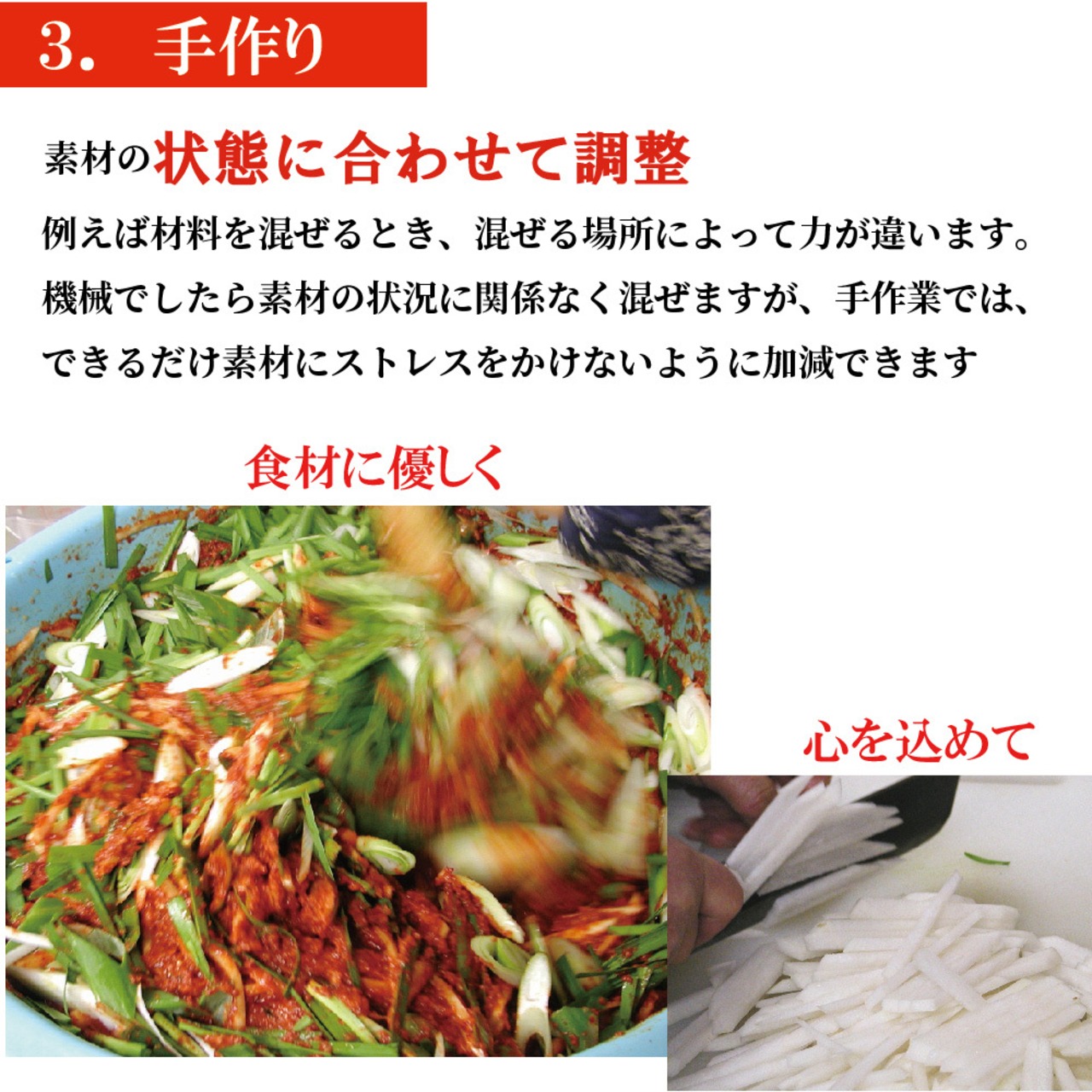 大根、ネギ、ニラ、唐辛子二種、玉ねぎ、りんご、パイナップル、ニンニク、ショウガ、アミエビ塩辛、砂糖、煮干しエキス、もち米粉、牛骨スープ、昆布、海老、椎茸、食塩