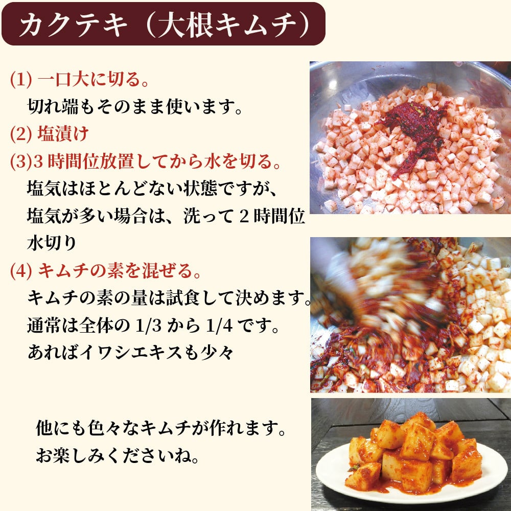 塩漬け白菜に混ぜるだけで、さまざまな種類のキムチが楽しめます。白菜キムチ、カクテキ(大根キムチ)、オイキムチ(きゅうりキムチ)に最適です。鍋料理や炒め物にもアクセントとしておすすめです!