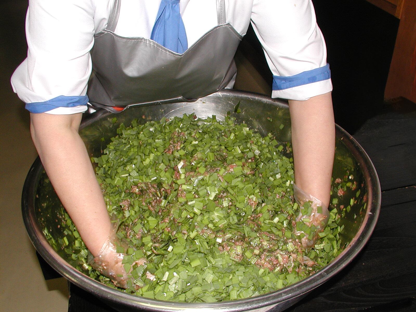にら、牛豚合挽肉、小麦粉、片栗粉、玉ねぎ、生姜、卵、醤油、みりん、酒、砂糖、食塩、ごま油、椎茸、胡椒