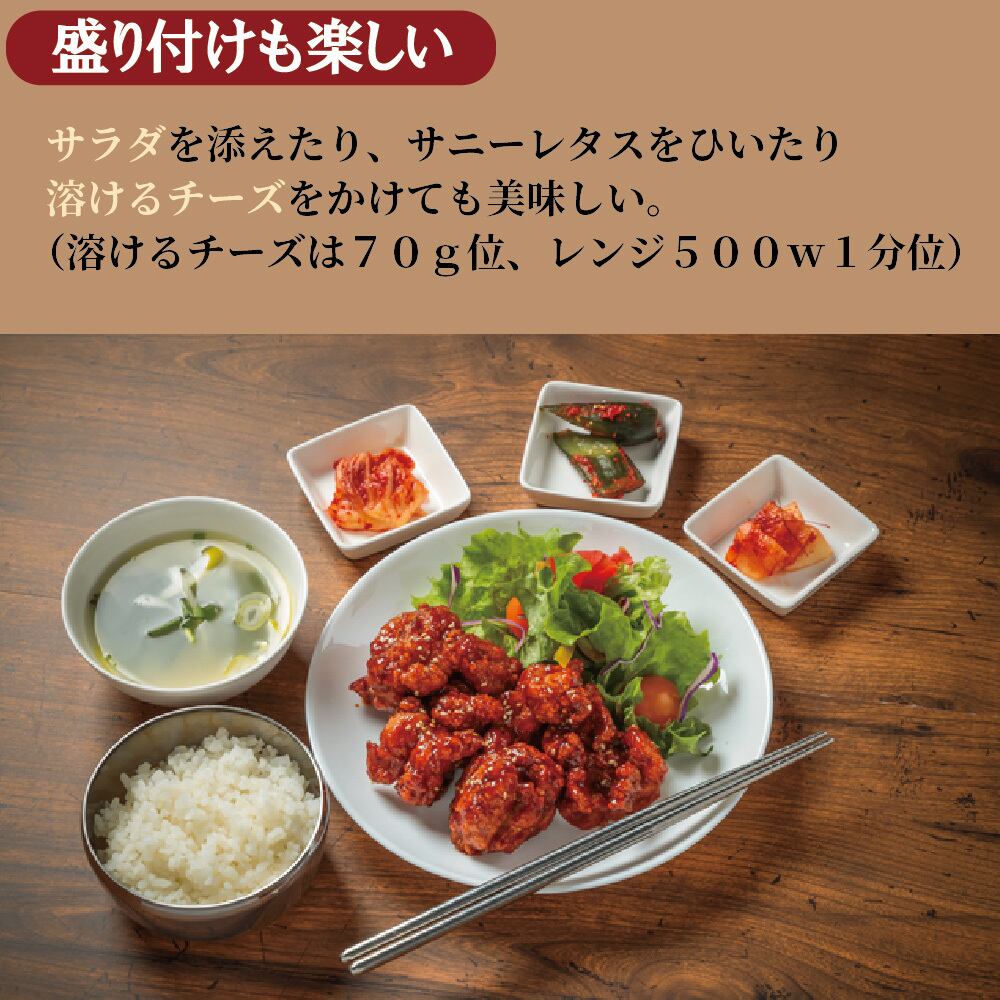 このヤンニョムチキンには、厳選された鶏肉を使用しています。特製のヤンニョムソースには、ニンニクや生姜、コチュジャンなどの風味豊かな調味料が使用され、甘さと辛さの絶妙なバランスを実現しました。温めるだけで簡単に本格的な味わいを楽しめる一品です。